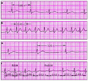 | Рис. 3.61. Номотопные нарушения ритма. а - ЧСС - 75 в мин, б - синусовая тахикардия (ЧСС - 150 в мин), синусовая брадикардия (ЧСС - 50 в мин), г - синусовая (дыхательная) аритмия |