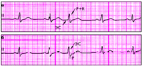 | Рис. 3.68. Экстрасистолы из АВ-соединения с одновременным возбуждением предсердий и желудочков (а) и более ранним возбуждением желудочков (б) |