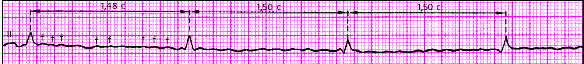 | Рис. 3.60. ЭКГ при вставочной (интерполированной) желудочковой экстрасистоле. Компенсаторная пауза отсутствует |