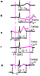 | Рис. 3.118. Схема изменений ЭКГ при нарушениях электролитного обмена. а - норма; б - гипокалиемия; в - гиперкалиемия; г - гипокальциемия; д - гиперкальциемия |