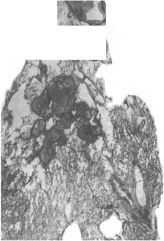 легкого, в периваскулярной или перибронхиальной ткани. Некоторые из них располагаются непосредственно в стенке кровеносных сосудов. Вокруг очагов обычно развивается эмфизема. В поздние фазы процесса развивается интерстициальный сетчатый склероз, особенно выраженный в верхних отделах легкого. В последних наряду с поражением интерстициальной ткани наблюдается образование массивных фиброзных рубцов на месте бывших туберкулезных очагов. В легочной ткани на фоне эмфиземы и фиброзных изменений могут быть инкапсулированные казеозные очаги, четко отграниченные от окружающей ткани (рис. 1.5).