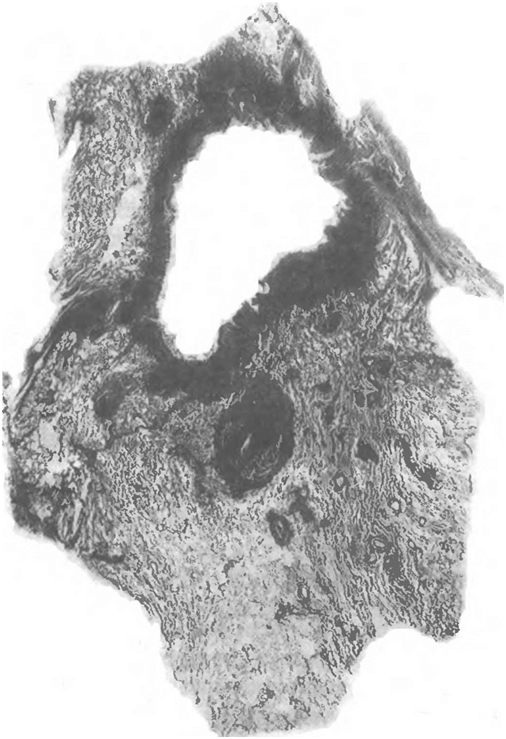 В стенках расширенных бронхов, бронхоэктатических полостей и очищенных каверн обычно выражено неспецифическое воспаление. При значительном склерозе и отсутствии при нем активных туберкулезных изменений имеется цирроз легкого как последствие перенесенного туберкулеза (рис. 1.11).