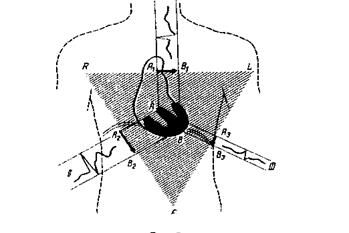 1. в отведениях от конечностей наибольшая величина QRS (алгебраическая сумма (+) и (-) зубцов) регистрируется в том отведении, ось которого совпадает с электрической осью сердца, причем проекция электрической оси на (+) часть оси данного отведения характеризуется преобладанием (+) R, а на (-) часть - (-) S.