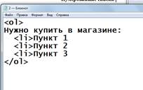 Нумерованный список часто называется упорядоченным (Ordered List) и представляет собой определенную последовательность элементов. Для создания нумерованного списка используется тег-контейнер <OL>, внутри которого располагаются пункты перечня информационных данных, за указание которых отвечает специальный тег <LI> (List Item — пункт списка или элемент списка)