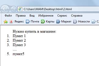 Иногда может возникнуть ситуация, когда список содержит определенный разрыв в последовательности представления пунктов (например, после пункта 3 должен идти пункт 5). Для этой цели используется специальный параметр тега <li> - VALUE