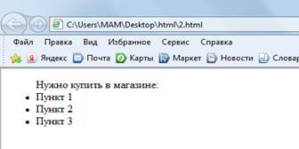 Маркированный список определяется тем, что перед каждым элементом списка добавляется небольшой маркер, обычно в виде закрашенного кружка. Сам список формируется с помощью контейнера <ul>,а каждый пункт списка начинается с тега <li>, как показано ниже.