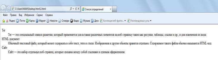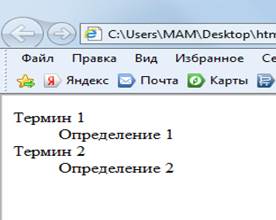 Список определений состоит из двух элементов — термина и его определения. Сам список задается с помощью контейнера <dl>,термин — тегом <dt>, а его определение — с помощью тега <dd>. Вложение тегов для создания списка определений продемонстрировано в примере: