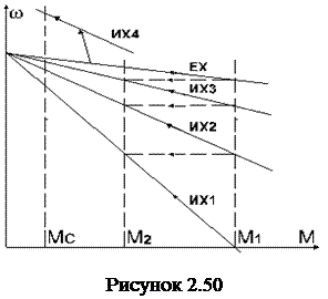 При переводе ключа в третье положение включены: КЛ, КВ (двигатель подключен к сети и начинается разгон с полностью введенными пусковыми сопротивлениями). Включается КУП, поле нарастает до номинального значения. Включается КМТ, ЭМТ – двигатель растормаживается. Включаются РУ2 и РУ3 от броска тока, включается РДВ и встает на самоблокировку, включается КЭ, отключается РУ1 (отсчет уставки), идет разгон по ИХ1 (см. рисунок 2.50). В момент времени t = tуРУ1 включается КУ1, двигатель выходит на ИМХ2; в момент времени t = tуРУ1+tуРУ2, двигатель выходит на ИМХ3; в момент времени t = tуРУ1+tуРУ2+tуРУ3, двигатель выходит на ЕХ.