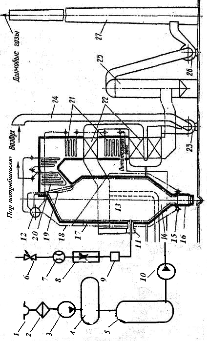 | Рис. 4.1. Схема котельной установки на газовом горючем: 1 -– заборное устройство, 2 -– фильтр, 3 – насос, 4 – отстойник, 5 – катионатор, 6 – запорный вентиль, 7 – расходомер, 8 – редуктор, 9 -–регулятор подачи газа, 10–насос, 11– горелка, 12– барабан котла, 13– топка, 14–холодная воронка, 15–коллекторы экранов, 16 –шлаковый комод, 17 – топочные экраны (подъемные трубы), 18 – водоподводящие (отпускные) трубы, 19–фестон, 20 – пароперегреватель, 21– водяной экономайзер, 22 — воздухоподогреватель, 23 — дутьевой вентилятор, 24 — воздуховод, 25 — газоочистительная установка, 26-– дымосос, 27 -– дымовая труба |
