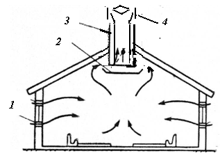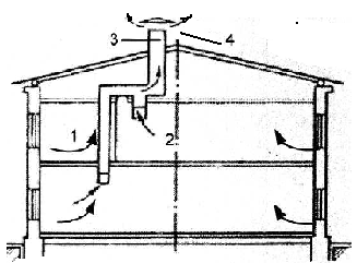 1 – инфильтрация воздуха в помещение; 2 – вентиляционные входы удаляемого воздуха; 3 – вентиляционные каналы; 4 – дефлекторы