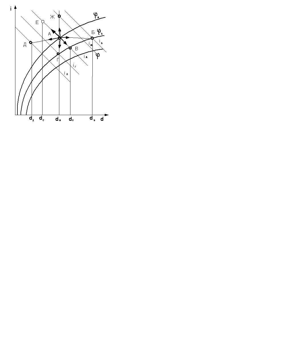 Ш е с т о й случай. Воздух (точка Ж) подвергается нагреванию в калориферах при постоянном влагосодержании (dЖ = dА ).