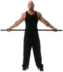 Использование трости. Другое простое техническое устройство, которую я использую в работе с клиентами - то, что я называю тростью. Орудие ничуть не более экзотическое, чем рукоятка метлы. Держите ее сзади, напротив низа спины, параллельно полу. Беритесь за нее ладонями вперед с обеих концов, вытянув руки. Проводите по крайней мере 10 минут в день в этом положении, ходя по кругу и сохраняя это положение – чем дольше, тем лучше. Трость будет оттягивать ваши плечи назад, выравнивая их надлежащим образом, и заставлять принимать ваш позвоночник более благоприятное положение. Убедитесь, что держите голову высоко и прямо: задняя часть вашего уха должна находиться непосредственно над срединной линией вашего дельтоида (неплохо было бы подыскать напарника, типа такого, как на этой картинке, чтобы ходить с вами).