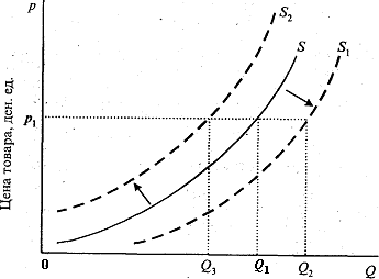 | Изменение предложения под влиянием неценовых факторов предложения приводит к сдвигам кривой предложения (рис.2). Если неценовые факторы приводят к увеличению предложения, то кривая предложения сдвигается вправо вниз (от S к S1). При постоянной цене P1 предложение увеличится до Q2. При сокращении предложения под воздействием неценовых факторов кривая предложения сдвигается влево вверх (от S1 к S2), а предложение при этой цене (P1) сократится до Q3. |