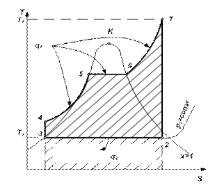 Подвод и отвод тепла в цикле происходит при постоянном давлении. Тогда количество теплоты в процессе 4–5–6–1, используемой для нагрева воды, парообразования и перегрева, выразим через энтальпии: