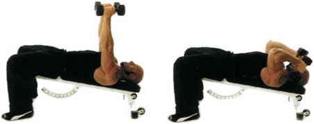 Установите угол обратного наклона скамьи от 20 до 30 градусов (или подложите под ножки плоские бруски). Затем, с двумя гантелями одновременно, делайте упражнение, как обычно,