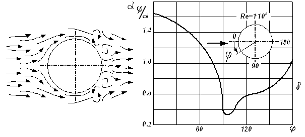 - местное значение коэффициента теплоотдачи, α - среднее его значение по контуру. Как видно из рисунка, в месте набегания потока на цилиндр (
