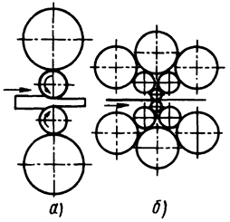 Рис. 3.10. Схемы четырехвалковой (а) и многовалковой (б) прокатки