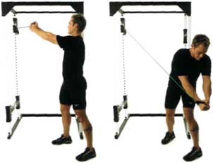 Прикрепите рукоять троса к верхнему блоку, обычно это делают на кроссовере. Встаньте боком таким образом, чтобы суметь ухватить рукоять обеими руками. Ваши кисти должны находиться вблизи головы со стороны тренажера. Прямыми руками наотмашь проносите рукоятку наискось мимо тела, будто рубите лес, заканчивая положением кистей на уровне колена в самой дальней от тренажера позиции. Сосредоточьте внимание на брюшной области, поскольку заканчивать движение вы должны стараться именно силой этих мышц. Сделайте все повторения, а затем, не отдыхая, поменяйте сторону и повторите их.