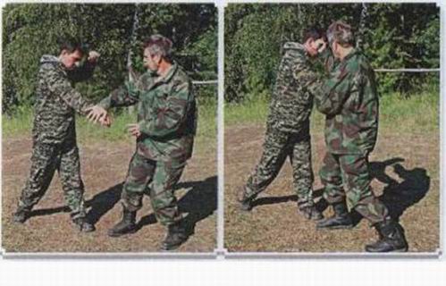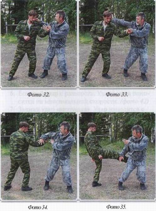 Примечание: Никогда не атакуйте противника одиночным ударом. Всегда нападайте серией из че- тырёх-семи ударов. Атака всегда идёт по открытому месту. Открылись глаза — атакуйте по глазам. Открылось горло — бейте по горлу. Открылся пах — атакуйте в промежность. Удары по глазам и горлу должны