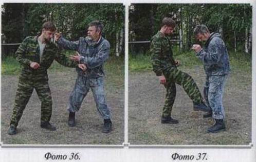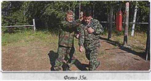 Примечание 4: Раскрутка, как и скрутка, позволяет легко зайти за спину противника. Это делается двумя способами, которые надо специально отработать. Первый — через захват атакующей руки и уход с линии атаки, (фото 35)