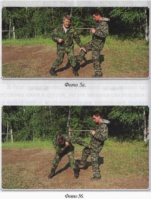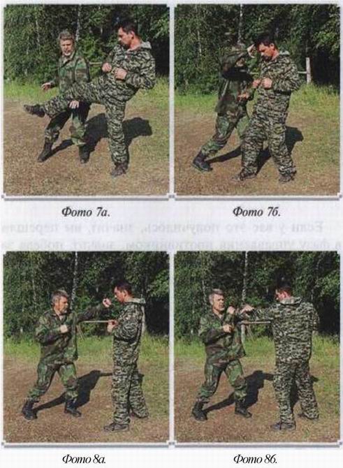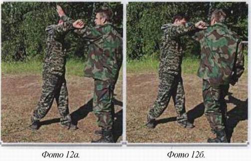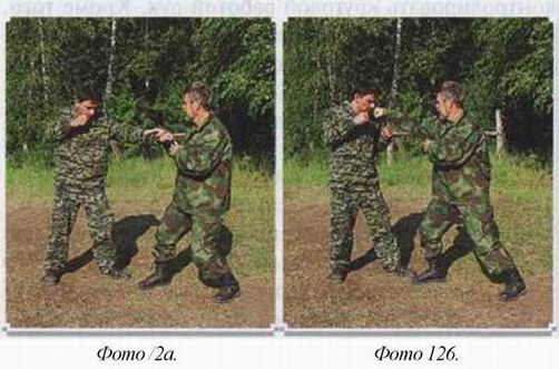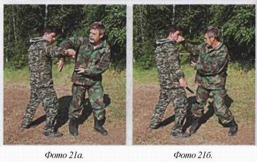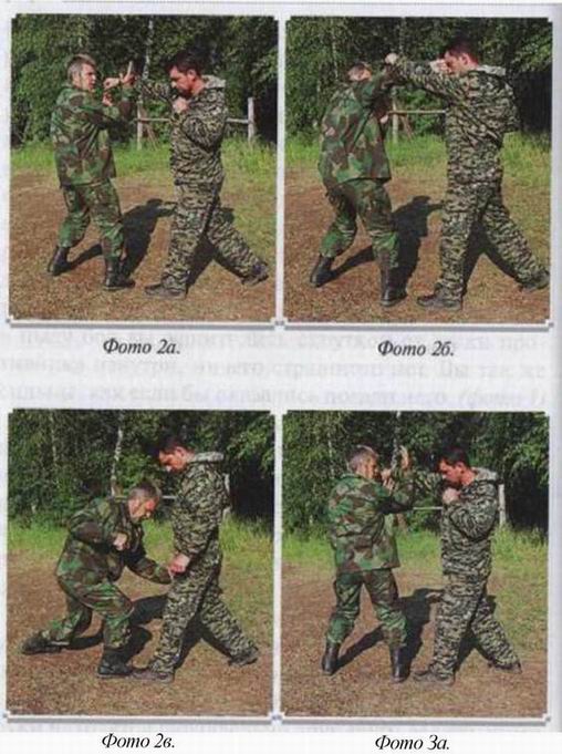 Одно движение мягкое, цель его изменить траекторию удара. Другое — мощное, выводящее противника из равновесия. Фактически, последнее является ударом по атакующим конечностям. Этот удар круговой, осью вращения которого является позвоночник. Если он направлен на атакующую вас ногу, то оставшийся на одной ноге противник тут же начинает вращаться. То же самое происходит при атаке вас руками. Вы не только оказываетесь сзади, но в положении, когда траектория атаки противника сбита, вы можете сделать с ним всё что угодно. Но если в пылу боя вы защитились скруткой от атаки противника изнутри, ничего страшного нет. Вы так же сильны, как если бы оказались позади него, (фото /) Для этого надо знать правило поворота. Защищаясь, вы поворачиваете корпус плечом к противнику и сразу уходите от его второго удара, к тому же ваша рука от него защищает. Достаточно её повернуть и вы захватите атакующую руку противника. Дальше рывок, вывод его из равновесия, и вот вы уже опять сзади, (фото 2)