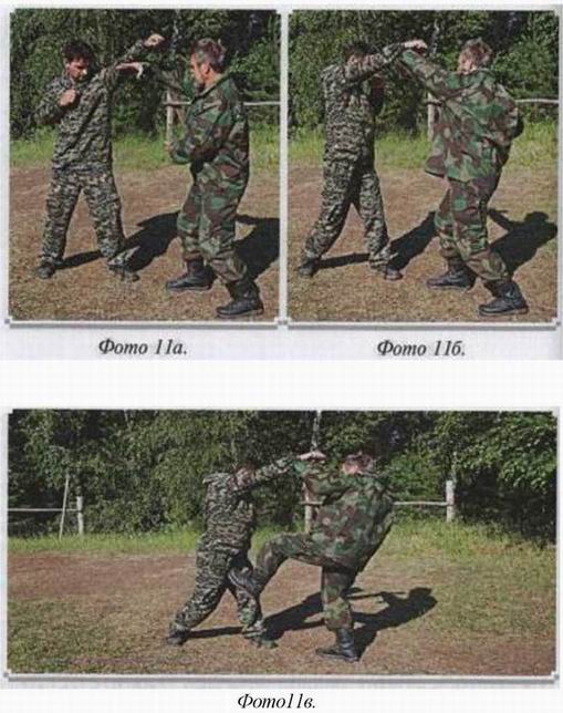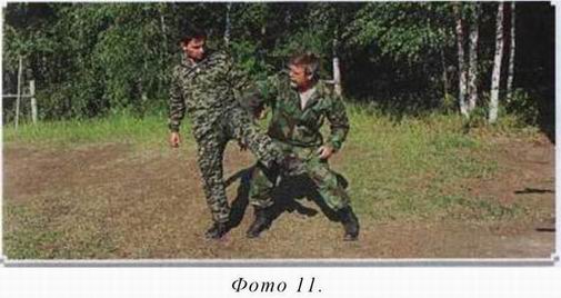 Потом либо бьёте ногой в пах, либо делаете перехват руки противника и атакуете по «чистому полю» и руками, и ногами. (фото 11)