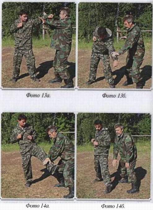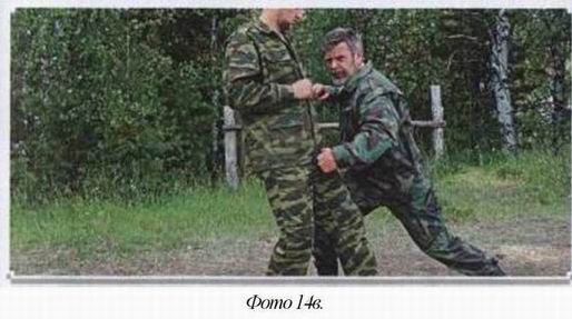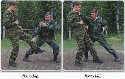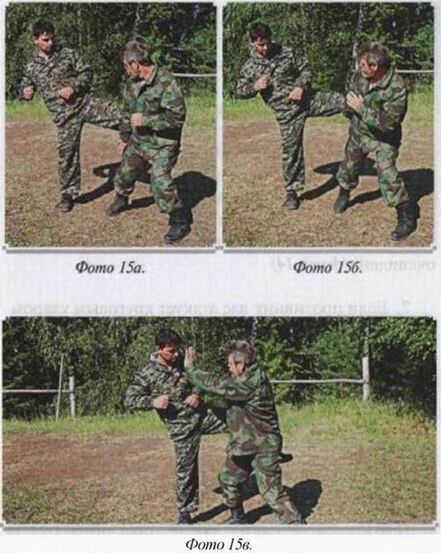 2. Противник атакует вас прямым ударом ноги в пах. Крестом вы останавливаете его ноги и разворачиваете нападающего спиной к вам, конец схватки очевиден, (фото 14)