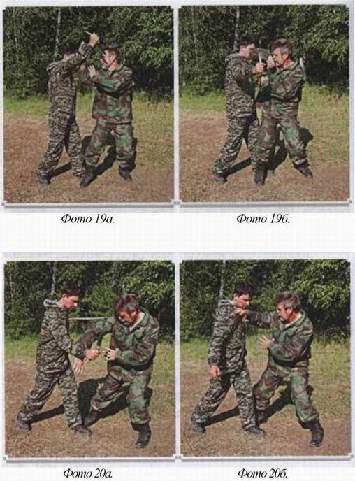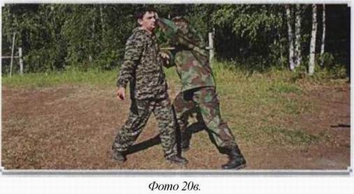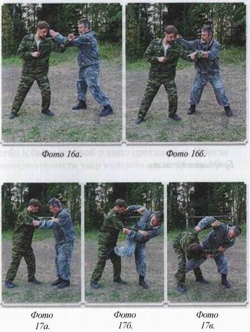 локтя в солнечное сплетение, либо хлёстким ударом обратной стороной кисти по переносице противника. Дальше атакуйте в пах мощным ударом ноги или ломайте колено. Тут дело ваше. Как покажется вам удобнее, (фото 17)