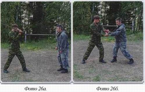 Примечание 1: В реальном бою нижние колющие удары лучше принимать скруткой, она позволяет заходить за противника. Раскрутка такой возможности вам не даёт, (фото 25)