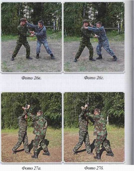 двигаясь по кругу, отводит в сторону направленное в вас оружие. При этом другая рука, колено и ваша голова тут же атакуют. Получается, что оружие противнику только мешает. Оно сковывает его движения. (фото 24)