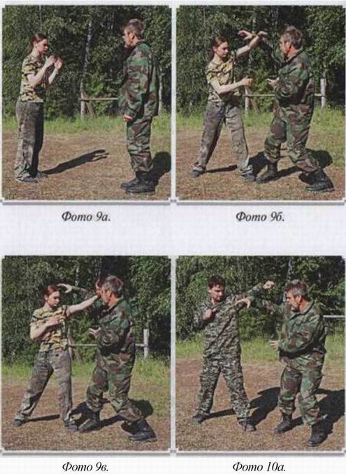 1. Вас атакуют прямым ударом в лицо. Ваша чуть согнутая рука подбивает руку противника снизу вверх и вы, сделав шаг, атакуете его этой рукой в переносицу. (фото 9)
