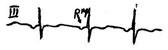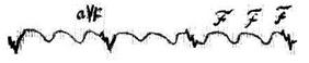 Рис. 6. Правильная форма трепетания предсердий 3 : 1 с частотой ритма желудочков 96 в мин. Вместо зубца Р в диастоле волны F - трепетания предсердий. Они одинаковой конфигурации и непосредственно переходят одна в другую (симптом «зубьев пилы».