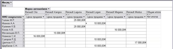 ■ пусть полем столбцов будет поле «Марка автомобиля», полем строк- «ФИО покупателя», полем итогов- «Цена продажи», полем фильтра-«Месяц». Зацепляем л.к.м. названия полей из списка и тащим их на соответствующие места в таблице:
