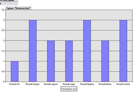 ■ Полем фильтра сделайте снова «Дата поставки», полем данных – «Количество», полем категорий- «Марка авто». Увидим, сколько авто каждой марки мы закупили за все время. Данные можно отфильтровать по датам поставок: