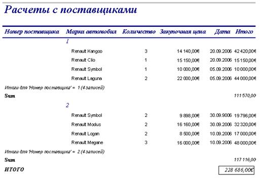 ■ По умолчанию задана группировка по полю «Марка авто», мы бы хотели сгруппировать по номеру поставщика, поэтому нажмите кнопку “ <”, выберите из списка полей «Номер поставщика», нажмите “ >”