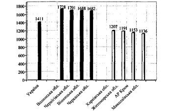 Анализ региональных особенностей заболеваемости в Украине показывает, что разница между максимальными и минимальными значениями соответствующих показателей достаточно ощутимая. По распространенности болезней - от 1728,6 на 1000 населения в Волынской до 1136,8 ‰ в Николаевской областях (рис. 24), за первичной заболеваемостью - от 816 ‰ в Львовской до 523 ‰ - в Николаевской. (рис. 25)