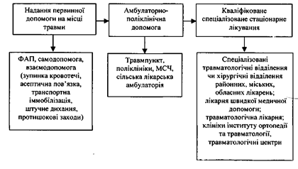 Основным организационным принципом предоставления помощи травмированным есть приближение первичной медицинской помощи к месту травмы. По экспертным оценкам до 80-90 % травмированных нуждаются в амбулаторной травматологической помощи в травматологических пунктах территориальных поликлиник. Последним этапом помощи является стационарная помощь. Эксперты считают, что до 26 % больных с переломами костей нуждаются в стационарном лечении, при других видах травм он значительно меньший. В больших городах таких больных госпитализируют в травматологические отделения, специальные палаты или в больницы скорой медицинской помощи.