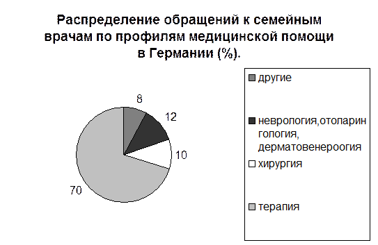 Объем медицинской помощи по данным общей практики Германии представленной на рисунке №11. 70% обращений приходится на внутренние болезни, 10% - на хирургические, около 12% - на невро-, отоларинго- дерматовенерологические.