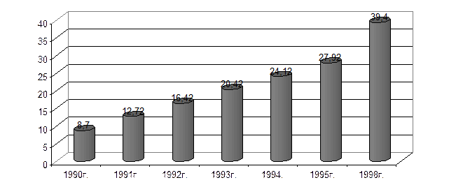 Рисунок №5. Частота абортов в Украине, 1990-1998 гг. (на 1000 женщин детородного возраста)