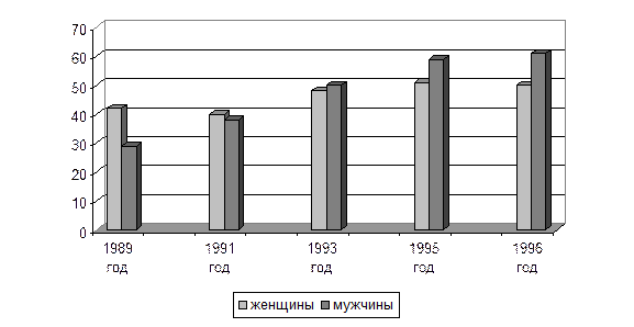 Рисунок №8. Половые особенности уровней бесплодия, 1989-1996 гг. (на 10 тыс. населения детородного возраста)