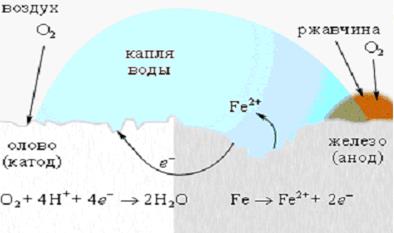 Для защиты железа от коррозии используются всевозможные покрытия: краска, слой металла (олова, цинка). При этом краска и олово предохраняют от коррозии до тех пор, пока защитный слой цел. Появление в нем трещин и царапин способствует проникновению влаги и воздуха к поверхности железа, и процесс коррозии возобновляется, причем в случае оловянного покрытия он даже ускоряется, поскольку олово служит катодом в электрохимическом процессе (рисунок 4).