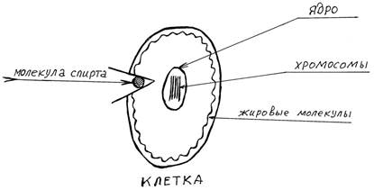 Молекула спирта подходит к молекуле жира, взаимодействует с ней и вышибает оболочку клетки. Клетка повреждена. Именно в результате этого алкогольного повреждения клетки, внутрь её может попасть всё, что угодно: «плохая экология», химия, шлаки. Другие молекулы может “затянуть” внутрь повреждённой клетки через рану, нанесённую ей молекулой спирта. А внутри клетки — ядро, хромосомы. В конечном счёте алкоголь данную клетку может убить совсем.