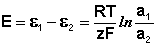 Уравнение (III.45) объясняет также и работоспособность т.н. концентрационных цепей – гальванических элементов, состоящих из двух одинаковых металлических электродов, опущенных в растворы соли этого металла с различными активностями а1 > а2. Катодом в этом случае будет являться электрод с большей концентрацией, т.к. стандартные электродные потенциалы обоих электродов равны; для ЭДС концентрационного гальванического элемента получаем:
