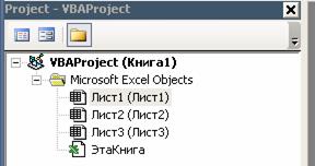 В окне проекта выводится проект всех открытых рабочих книг. Это позволяет легко копировать формы и коды из одного проекта в другой, что убыстряет процесс создания новых приложений