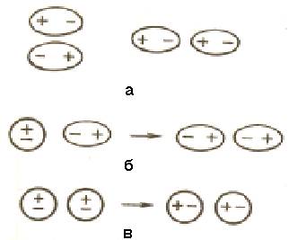 а – диполь-дипольное взаимодействие; б - индукционное взаимодействие;