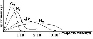 Однако, скорость отдельных молекул значительно различается. Распределение молекул по скоростям называется распределением Максвелла-Больцмана- оно зависит от t и типа газов: