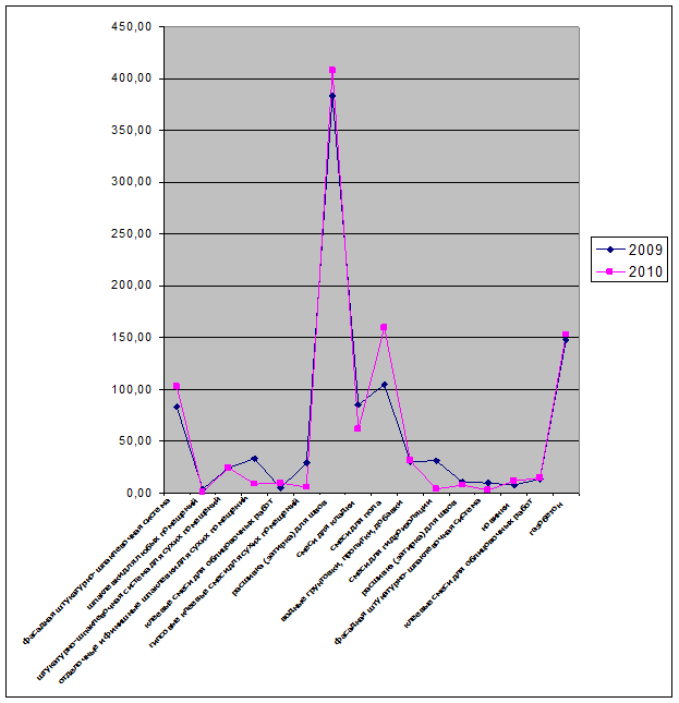 Значительное снижение объема продаж наблюдается по следующим позициям: шпаклевки для любых помещений снизились на 3,01 тыс.грн (74,9 %), отделочные и финишные шпаклевки для сухих помещений – на 24,07 тыс.грн. (72,6 %), гипсовые клеевые смеси для сухих помещений – 23,08 тыс.грн. (79,2 %), смеси для гидроизоляции – на 27,1 тыс.грн. (87 %), фасадная штукатурно-шпаклевочная система – на 7,02 тыс.грн. (69,9 %). Однако в целом, объем реализации не значительно увеличился - на 4,2 тыс.грн. (0,4 %). Такое снижение по некоторым товарным позициям обусловлено расширением торговых площадей основных конкурентов -крупных строительных супермаркетов, таких как «Новая линия», «Добростой», «Нова площа», которые имеют возможность закупать товар по более низким ценам.