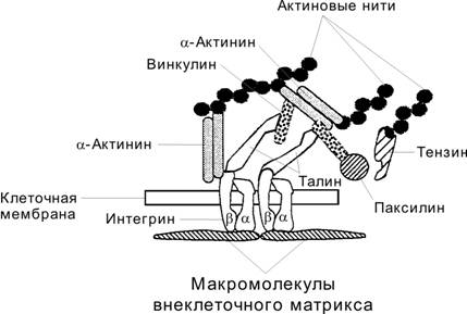 Прикрепление клеток к молекулам адгезии внеклеточного матрикса реализуют точечные (фокальные) адгезионные контакты (рис. 4-6). В образовании контакта участвуют трансмембранные рецепторы — интегрины, объединяющие внеклеточные и внутриклеточные структуры. Фокальный контакт содержит также винкулин, –актинин, талин и другие белки. Характер распределения макромолекул адгезии во внеклеточном матриксе (фибронектин, витронектин) определяет место окончательной локализации клетки в формирующейся ткани.