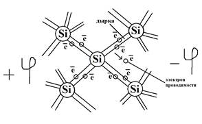 ↑t.Электроны отрываются от атомов, то в оболочке атома полупроводника остается дырка. (+)