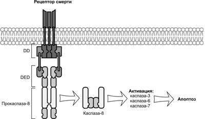 Рис. 4-12. Сигналы смерти активируют внутриклеточные сигнальные пути.В цитоплазматической части молекулы рецептора смерти присутствуют домены смерти DD (Death Domain), которые образуют тетрамерные комплексы с эффекторными доменами смерти DED(Death Effector Domain) в составе предшественника инициаторной каспазы-8. Этот комплекс назван смерть-индуцирующим сигнальным комплексом DISC (Death-Inducing Signaling Complex). Находясь в составе данного комплекса, прокаспаза-8 приобретает способность к активации путём аутопротеолитического расщепления, в результате которого образуется активная инициаторная каспаза-8. Она имеет гетеротетрамерную структуру, т.е. состоит из двух малых и двух больших субъединиц. Каспаза-8 активирует эффекторные каспазы, которые вовлекаются в апоптоз. [108]